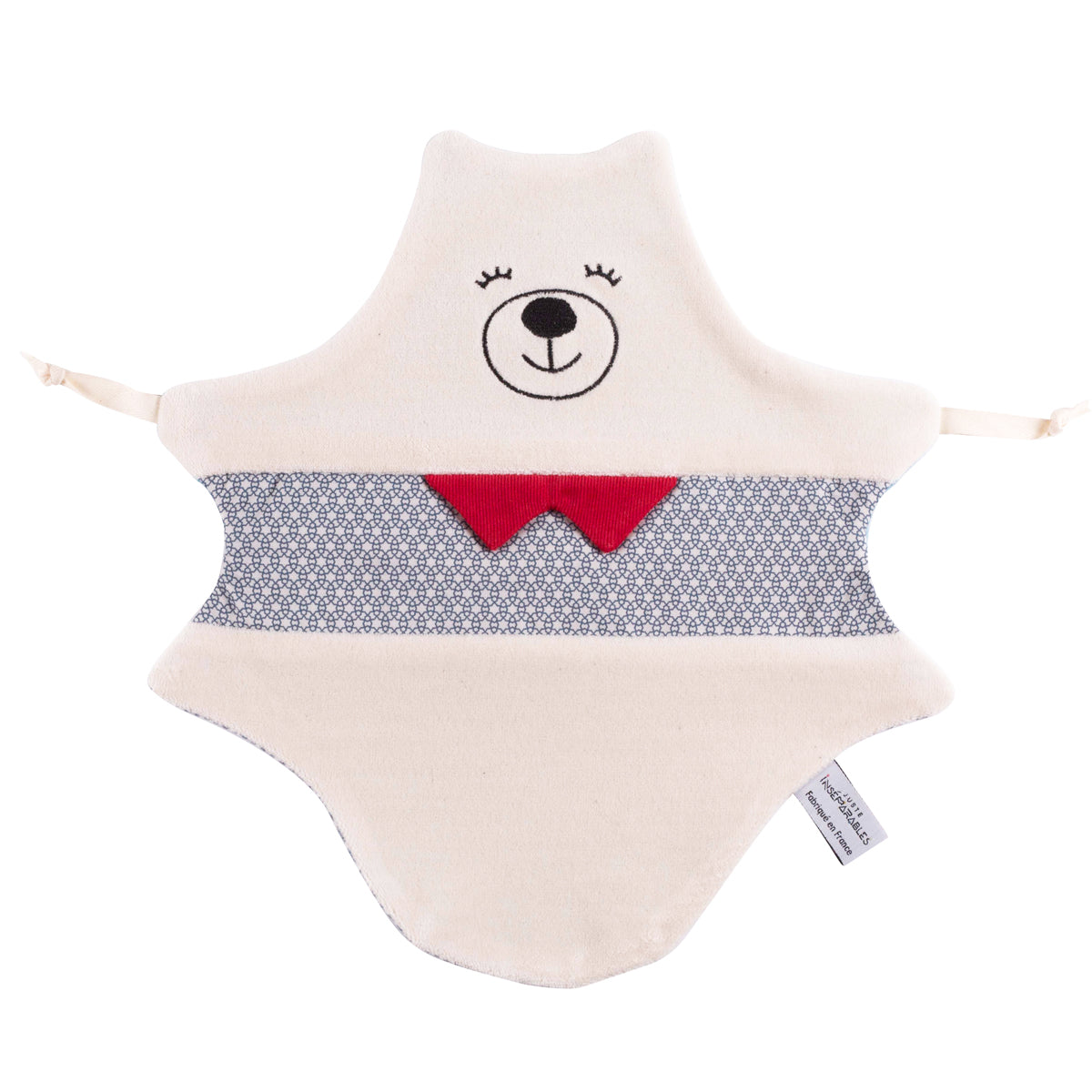 Doudou de 34 x 28 cm, avec une sérigraphie sur le devant, coutures renforcées, empiècement de tissu coloré et étiquette des super-pouvoirs brodée.