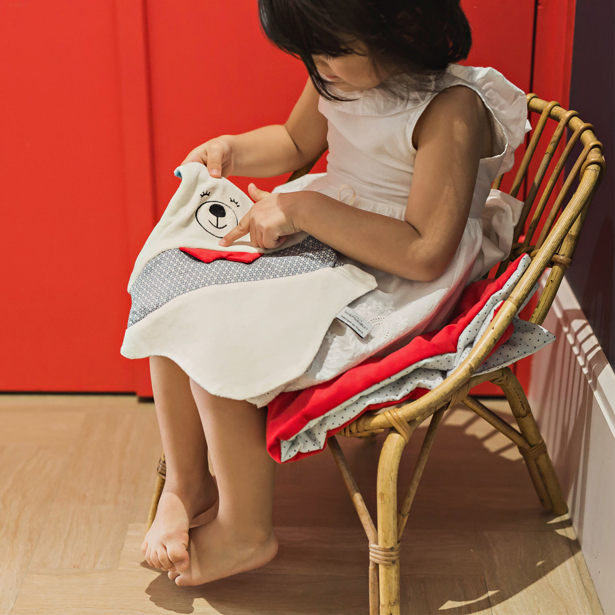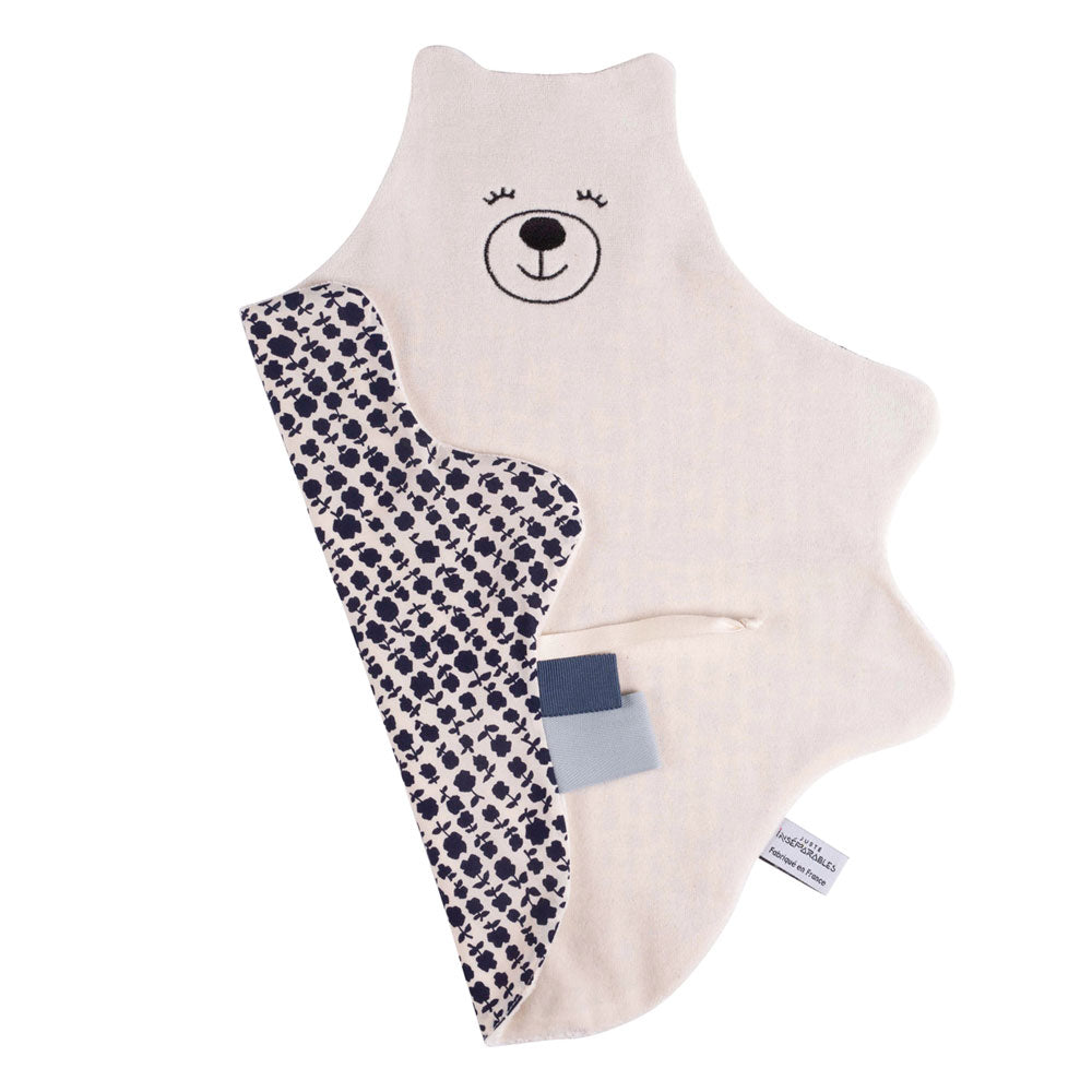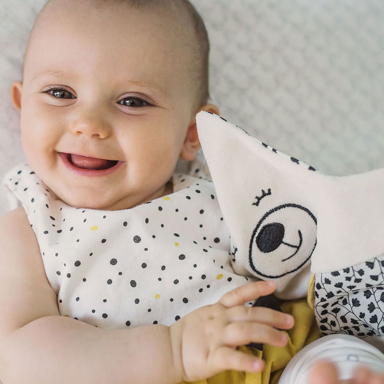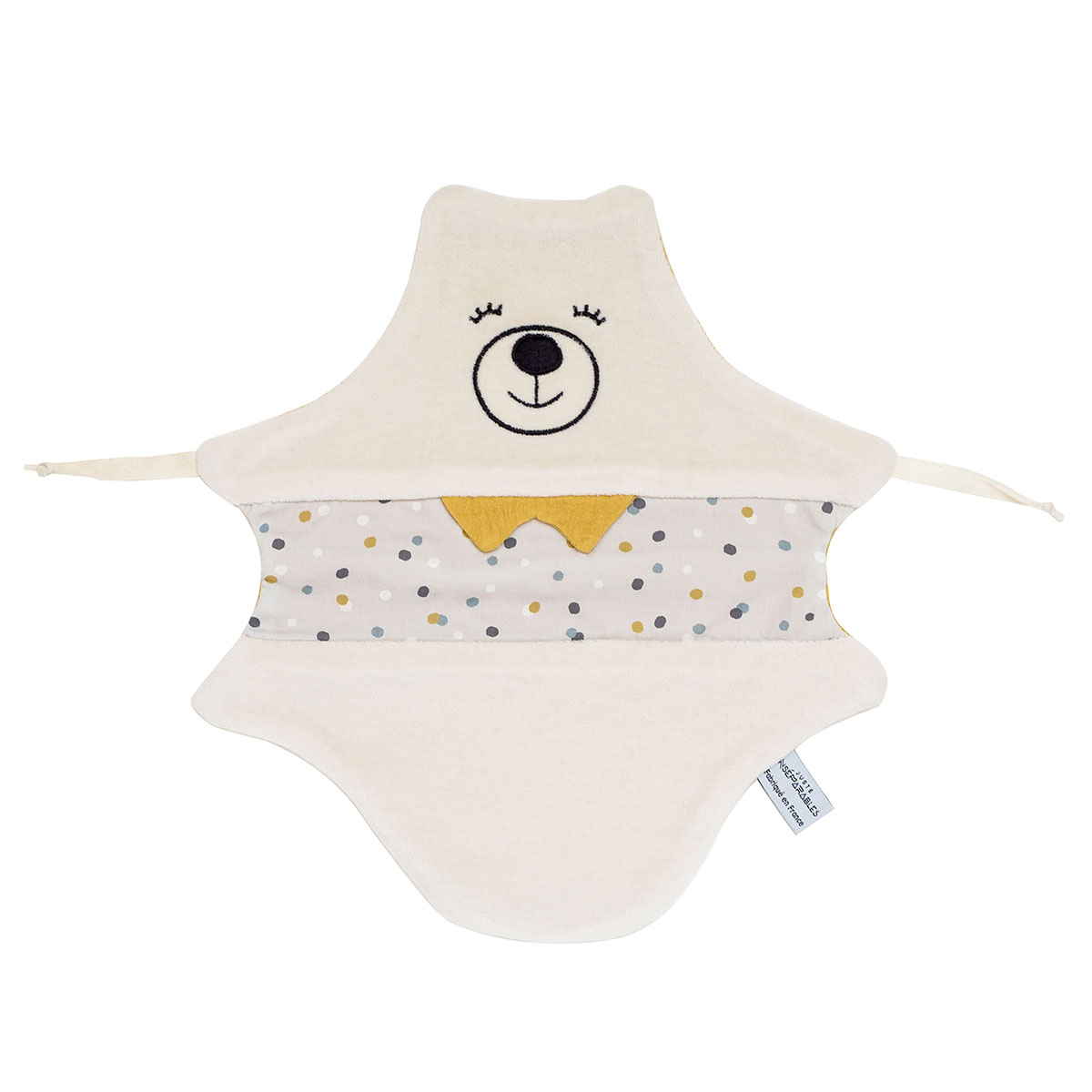 Pour l'éveil de bébé, rien de mieux qu'un petit compagnon tout plat, plus facile à câliner ! Chaque côté de doudou a un sens : l'un pour mâchouiller, l'autre pour tortiller... Les couleurs aussi sont contrastées pour être mieux perçues par bébé.