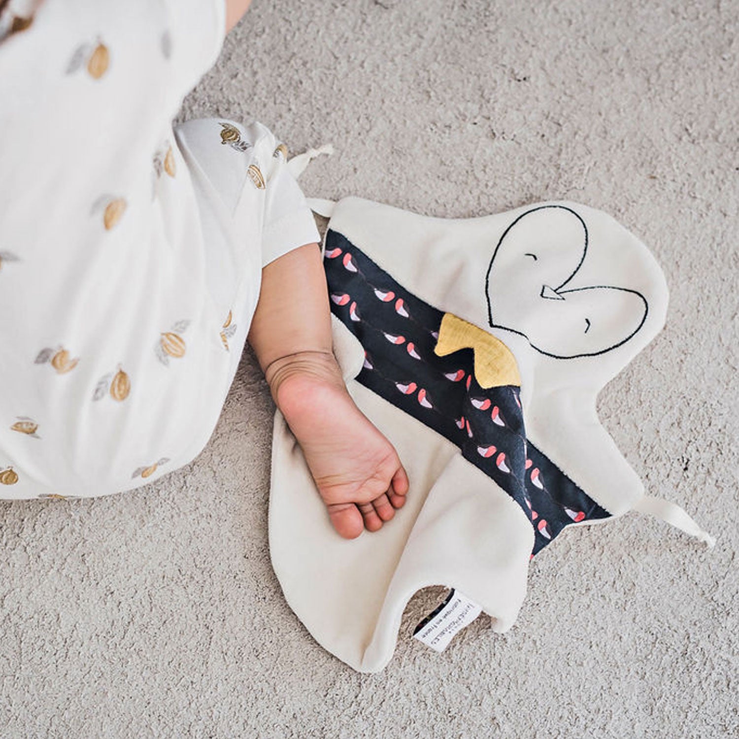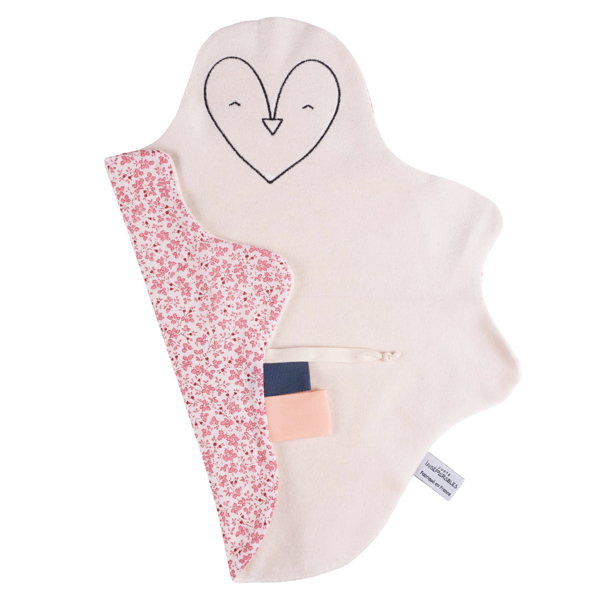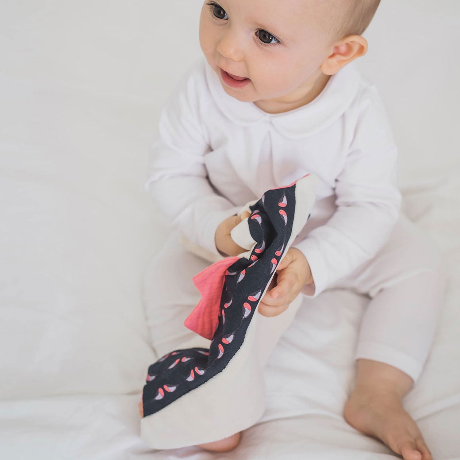 Pour l'éveil de bébé, rien de mieux qu'un petit compagnon tout plat, plus facile à câliner ! Chaque côté de doudou a un sens : l'un pour mâchouiller, l'autre pour tortiller... Les couleurs aussi sont contrastées pour être mieux perçues par bébé.